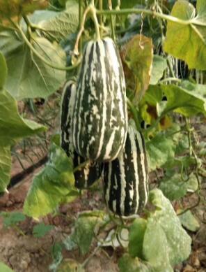 2、博洋9甜瓜苗品种:薄皮,开花后32-35天左右成熟,单瓜重1.0-1.6斤左右。果实粗棒状。灰白皮绿斑条。花纹清晰,外观新颖独特。果长I8-20厘米左右。果肉厚。种腔小。果肉黄绿色,口感酥脆,成熟后折光糖含量可达I2-I4左右,风味好。